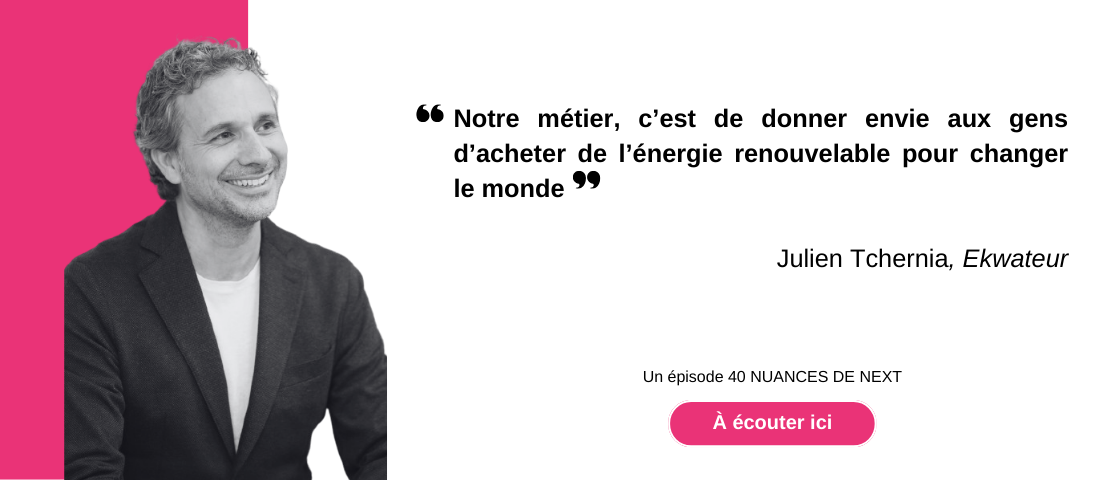 Fondé en 2016 par Julien Tchernia et Jonathan Martelli, Ekwateur est un fournisseur d’énergie verte, 100% renouvelable, qui s’adresse aux particuliers comme aux professionnels. De ce marché dominé par des géants industriels solidement ancrés, Julien Tchernia en a fait une force et une vraie motivation. En construisant une marque forte, l’objectif est simple : donner envie aux gens d'acheter de l'énergie renouvelable pour changer le monde. Et pour ça, Julien n’a pas hésité pas à décrocher son téléphone pour échanger en direct avec ses clients.